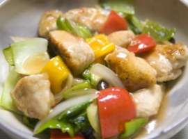 リーズナブルで使いやすいといわれる鶏むね肉。淡白なのが特徴ですが、個人的にはあのパサつき感が苦手。タジンで蒸し鶏にしたり、照り焼きにしたりするのですがどうもしっくりこない。そこであの食感は魚だろうと思い立ち、白身魚に見立てて甘酢あんと合わせてみたところ(白身魚の甘酢あんかけってありますね)、これが結構正解でした。片栗粉で膜を作ってこんがり焼いたのがよかったのかな。鶏むね肉は淡白な分、どこかで油を補ってあげるのがよいようですね。